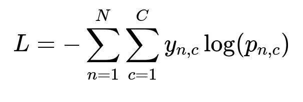 Where y_{n,c} is 1 if sample n belongs to class c, otherwise 0. p_{n,c} is the predicted probability for class c.