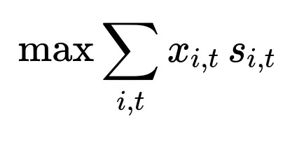 The system formulates the scheduling problem as an integer linear program. Let x_{i,t} be a binary variable that is 1 if notification i is sent at time t and 0 otherwise. Let s_{i,t} be the predicted score for sending notification i at time t. The objective is: