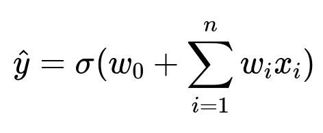 w_0 is the intercept term. x_i are the features, such as mutual friend count or shared groups. w_i are the learned weights for each feature. sigma(.) is the logistic function mapping the value into a probability between 0 and 1. When the probability crosses a chosen threshold, the pair is recommended to each other.