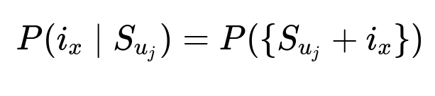 i_{x} is the candidate item. S_{u_{j}} is the sequence of items a user u has purchased in chronological order (up to the j-th purchase). The probability of a future purchase depends on how well item i_{x} fits into user u's prior sequence of shopping events.