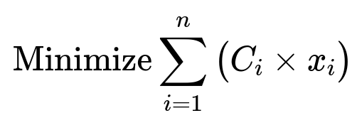 C_i is the cost per unit for each campaign i. x_i is the number of budget units allocated. The goal is to reduce total spending while meeting a baseline demand or performance threshold. Introduce constraints to ensure minimal required budgets for essential allocations.