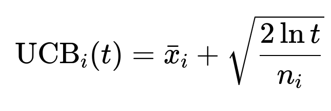 When using a multi-armed bandit, the Upper Confidence Bound approach is a common technique. One simplified example formula for the UCB at time t is: