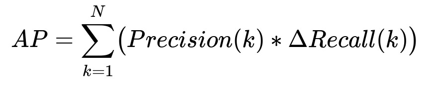They measure binary classifier quality using average precision (AP). One standard formula is shown below.
