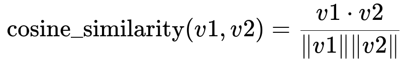 v1 is the embedding vector for the userâs search query. v2 is the embedding vector for a product listing. The dot represents the dot product between the vectors, and the norms in the denominator are the magnitudes of those vectors. Higher similarity scores indicate more relevant product results.