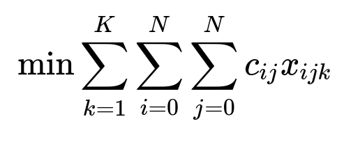 Here i and j represent locations (stores or delivery addresses), k represents a specific driver, c_{ij} is the cost (time or distance) from location i to j, and x_{ijk} is 1 if driver k travels from i to j, else 0.