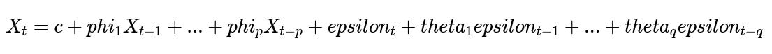 ARIMA-based methods, gradient boosting, or deep learning can be applied. Some time series models incorporate seasonality, trends, and external factors. One such example is an ARIMA variant with exogenous variables. A simplified version of the ARIMA(p, d, q) equation is shown below.