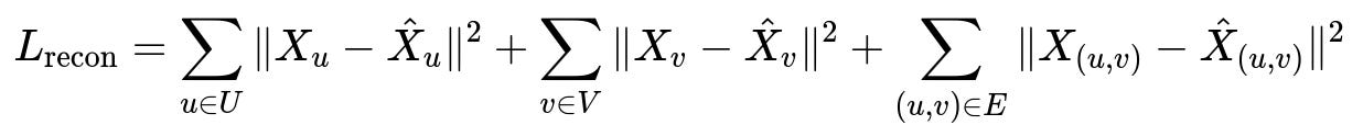L_recon is the overall reconstruction loss. X_u, X_v, and X_(u,v) are the original features of the consumer node, merchant node, and edge. hat{X}_u, hat{X}v, and hat{X}{(u,v)} are their reconstructed versions from the autoencoder. Minimizing L_recon helps the model learn typical behaviors.