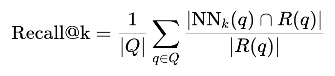 Here, Q is the set of query images. NN_k(q) is the set of top-k nearest neighbors for query q. R(q) is the set of relevant (matching) images for q.