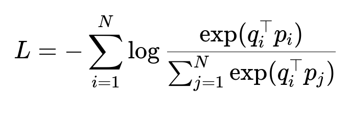 Above, q_i and p_i are the embedding vectors for the i-th query and its matching product. p_j is the embedding for a different product j in the same batch. This loss moves relevant pairs closer and irrelevant pairs farther in the embedding space.