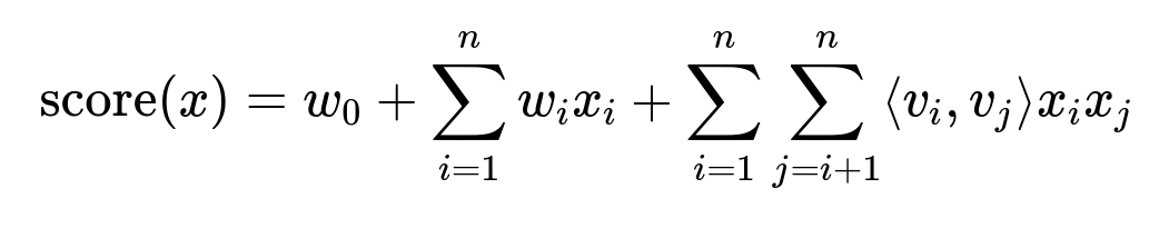 Here, x represents the feature vector of associate and content. w0 is the global bias term. w_i are the weights for each feature. v_i and v_j are latent factor vectors of dimension d. The last term is the pairwise interaction between features i and j. This factorization machine is integrated as the wide component to memorize patterns such as recurring seasonal behaviors. The deep component uses dense embeddings of the same input features to discover new patterns that were absent or sparse in historical data.