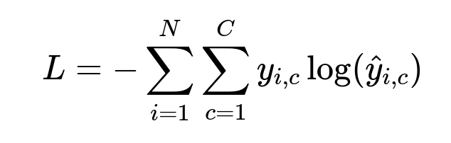 N is the number of training examples. C is the total number of Product Types. y_{i,c} is 1 if the i-th example belongs to Product Type c, otherwise 0. hat{y}_{i,c} is the predicted probability that example i belongs to class c.