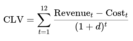 Here, Revenue_t is the revenue in month t, Cost_t is the associated cost, and d is a discount rate. In practice, you might model the raw or partially discounted revenue and then adjust with multipliers for cancellations or fees.