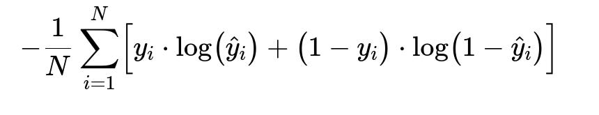 N is the number of training samples. y_i is 1 if the sample belongs to label i, 0 otherwise. y_hat_i is the predicted probability for label i.