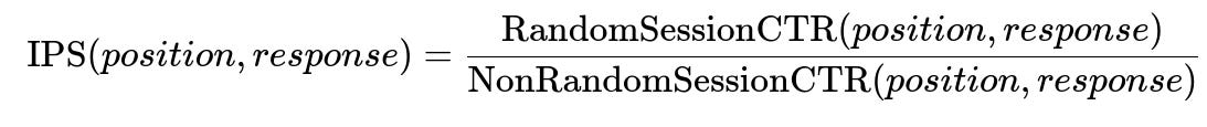 IPS(position, response) is the inverse propensity score. position is the rank of the item in the feed. response is whether the user clicked/liked/commented. RandomSessionCTR is the empirical CTR at that position in a random session. NonRandomSessionCTR is the empirical CTR at that position in a production session.