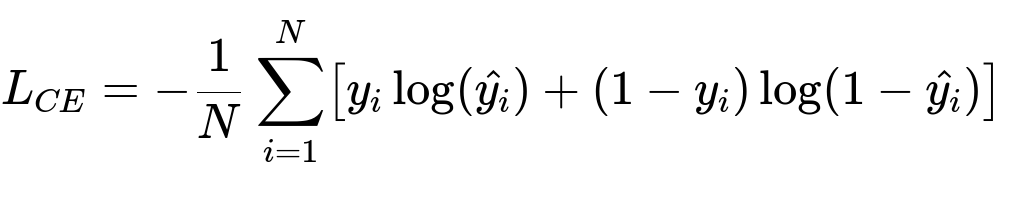 Here, N is the number of training examples, y_i is the true label for the i-th example (1 or 0), and hat{y_i} is the predicted probability for that example being 1.