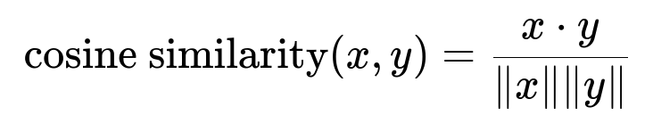 x and y are vector embeddings. x dot y is the dot product. norm x and norm y are the magnitudes of the vectors.