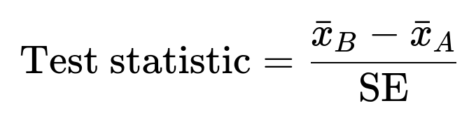 Where (\bar{x}_B) is the mean metric value in Variant B, (\bar{x}_A) is the mean metric value in Variant A, SE is the standard error of the difference, which is typically derived from the variance within each group and the sample sizes.