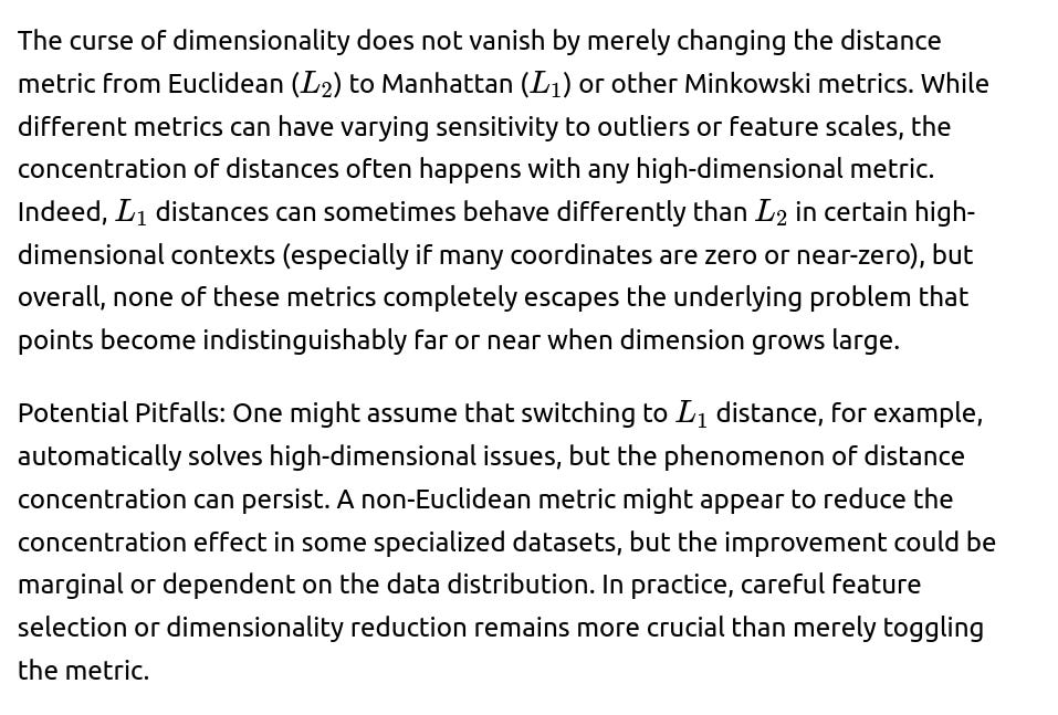 The fundamental reason is the geometry of high dimensions and the measure concentration that arises from it. The intuitive notion that “points close in Euclidean space have similar attributes” often fails as the number of dimensions grows, because any two random points can appear similarly distant. As an analogy, it’s challenging to identify “mountain peaks” if the entire terrain becomes almost flat. Distance-based algorithms rely on these peaks (or valleys) to locate neighborhoods or clusters; without them, performance deteriorates sharply.