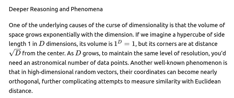 When considering high-dimensional geometry, several unintuitive effects arise. A common example is how the volume of an nn-dimensional hypercube is concentrated near its corners. Another well-known demonstration is that if you generate random points in a high-dimensional space, the distances between points often converge to a narrow range, so “near” and “far” points can become nearly indistinguishable. This is sometimes referred to as distance concentration or the concentration of measure phenomenon. In more practical terms, for distance-based machine learning methods, the metric used to discriminate among data points can become nearly uniform, hampering classification or clustering accuracy.