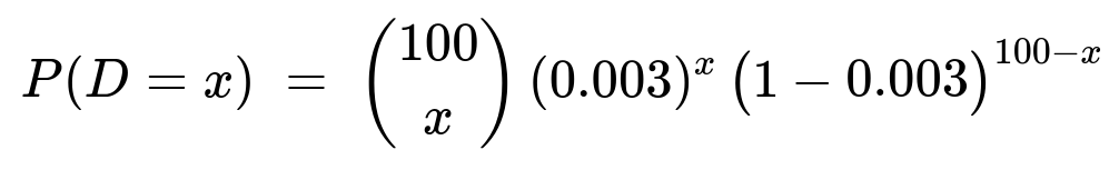 In this expression, x is the number of defective bolts in the box. This is often denoted Binomial(n=100, p=0.003). However, when n is relatively large (100) and p is relatively small (0.003), it is common to approximate this Binomial distribution by a Poisson with parameter lambda = n * p = 100 * 0.003 = 0.3.