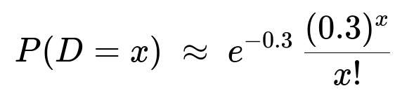 P(D=0) = e-0.3 * (0.3)0 / 0! = e-0.3 ≈ 0.7408