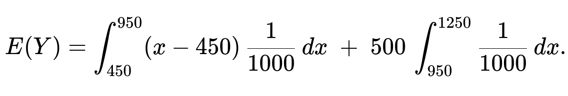 In the first integral, for x in [450, 950], the integrand is (x - 450). In the second integral, for x in (950, 1250], Y is always 500, and the probability mass there is the length 300/1000 = 0.30. Evaluating: