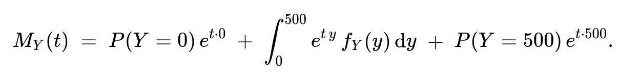 Carefully performing this integral for the continuous part yields (1/1000) [ (1/t) ( e^(t y) ) ]0500 if t≠0, plus the point masses. Such computations are commonly required for advanced insurance modeling or pricing more complex derivative-like structures associated with insurance payouts.