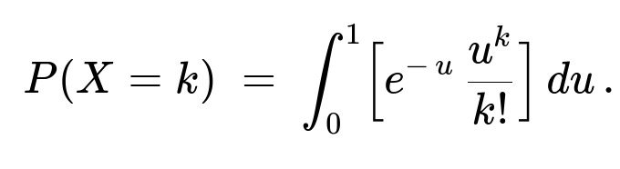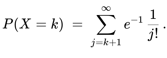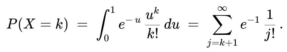 Therefore the random variable X can be seen as a “mixed Poisson” distribution: mixing Poisson(λ) over a Uniform(0,1) distribution for λ. And the final expression shows that for each nonnegative integer k, P(X=k) is the tail of the Poisson(1) series starting from j=k+1 onward.