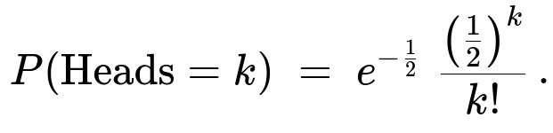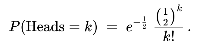 Substituting the Binomial(n, 1/2) and Poisson(1) PMFs, we get: