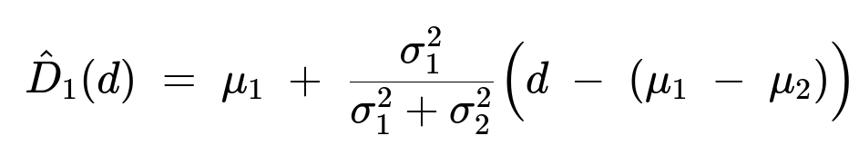# \hat{D1}(d) = mu1 + (sigma1^2 / (sigma1^2 + sigma2^2)) * (d - (mu1 - mu2))