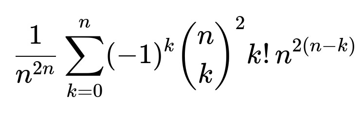 print(f"For n={test_n}, probability of no mutual best friendships = {prob}")