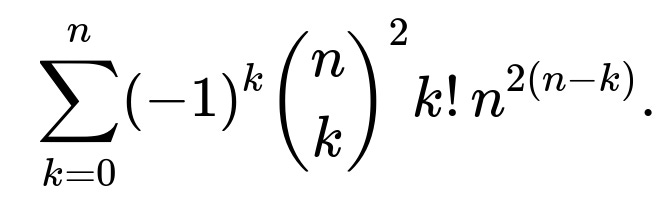 If a developer tried to implement the formula but used the wrong sign or misapplied combinatorial terms, they might get an incorrect result that fails to match small-n enumerations.