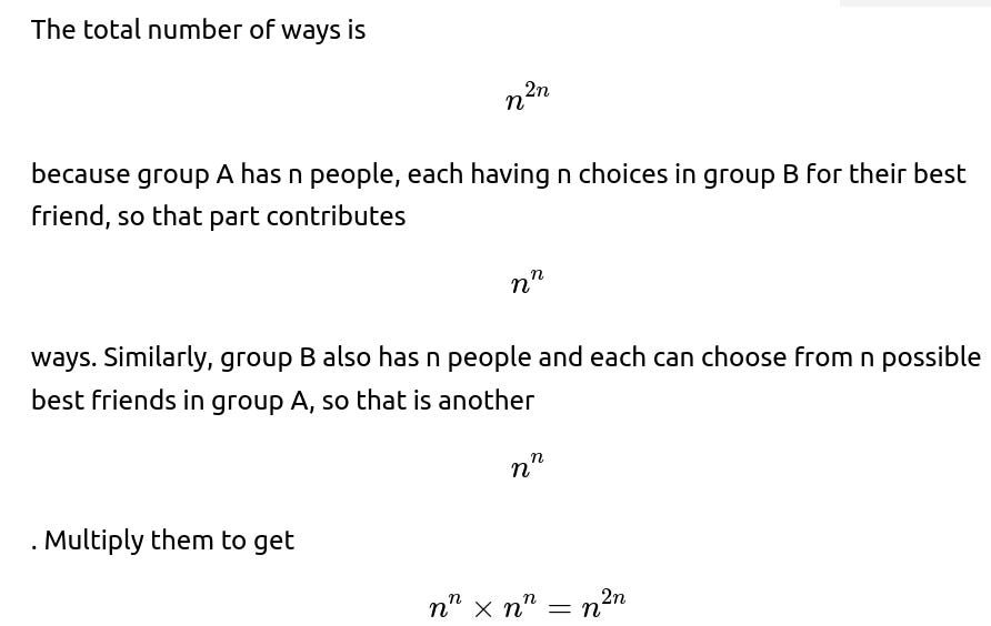 One way to understand this scenario is to think of each group as having exactly n individuals, with every individual in A choosing exactly one “best friend” in B, and every individual in B choosing exactly one “best friend” in A. The total number of ways these choices can be made is n^n for group A (because each of the n users picks from n possible best friends in B) multiplied by n^n for group B, yielding n^(2n) total possible ways of choosing best friends.