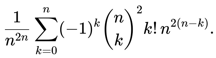 (which is the hallmark of the Inclusion-Exclusion principle), we count exactly the number of ways to have zero mutual best-friend pairs. Dividing by the total number of ways