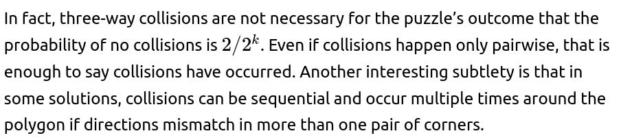 Essentially, we no longer have a single ant per corner. Instead, we have to consider how k midpoints connect to each other via corners. The collision conditions become more intricate. We would need to do a separate combinatorial enumeration: each ant picks one of two corners to walk toward first. After reaching that corner, it continues around the polygon with the chosen orientation. We must then check all possible ways they could meet.