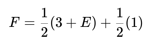 From the second equation for F: F = (1/2)(3 + E) + (1/2)(1). Expanding: F = 1.5 + E/2 + 0.5 = 2 + E/2.