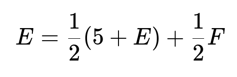 Substitute F into the first equation: E = (1/2)(5 + E) + (1/2)(2 + E/2). Multiply everything out: E = (5 + E)/2 + (2 + E/2)/2. E = (5 + E)/2 + (2/2) + (E/2)/2. E = (5 + E)/2 + 1 + E/4. Multiply both sides by 4 to clear denominators: 4E = 2(5 + E) + 4 + E. 4E = 10 + 2E + 4 + E = 14 + 3E. 4E - 3E = 14. E = 14.
