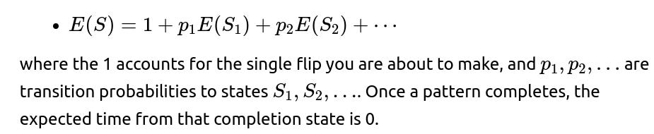 Yes, you can extend this logic to arbitrary coin flip patterns of any length. You would track states based on the currently matched prefix for each pattern. For every coin flip, you transition to the next state based on whether your partial pattern matches a longer prefix or resets. Then, when a complete pattern is recognized, that pattern is declared the “winner.” For more complex patterns, the state machine can have many states if there are multiple overlaps. The underlying principle—computing probabilities of pattern completion using Markov chain transitions—remains the same.