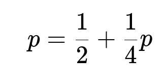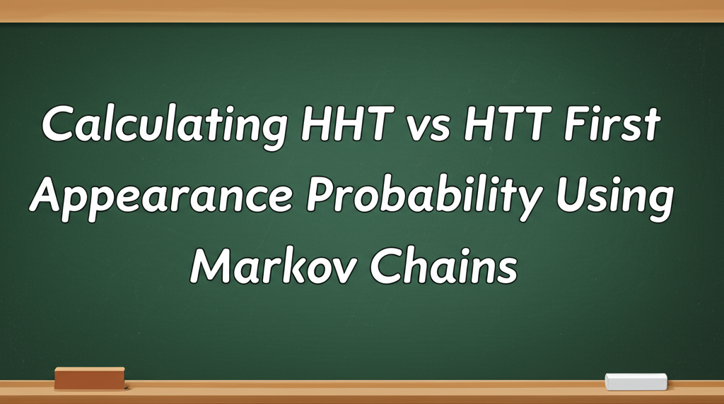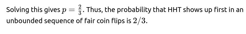 import random def simulate(num_trials=10_000_00): count_hht_first = 0 for _ in range(num_trials): seen = [] found_hht = False found_htt = False while not (found_hht or found_htt): flip = 'H' if random.random() < 0.5 else 'T' seen.append(flip) # Check last three flips if len(seen) >= 3: last_three = ''.join(seen[-3:]) if last_three == 'HHT': found_hht = True elif last_three == 'HTT': found_htt = True if found_hht: count_hht_first += 1 return count_hht_first / num_trials prob_estimate = simulate() print(prob_estimate)Over a large number of simulations, this should yield a number close to 0.666..., demonstrating that 2/3 is the correct result.