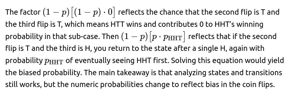 Partial matching logic is crucial in many pattern-finding tasks known as Penney’s Game type scenarios. The technique of building states based on how many characters of the pattern have been matched so far allows you to handle overlaps in the patterns. In this specific example, HHT and HTT share common partial prefixes that cause interesting reset behaviors. In other scenarios, you can have more complicated overlaps, requiring a more detailed state machine or an automaton to track these overlaps. The same fundamental Markov chain idea applies, and you typically end up solving linear equations for the probabilities of eventually hitting one pattern before the other.