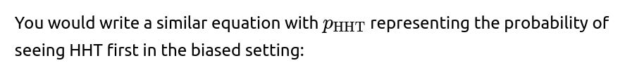 If the coin is biased such that it lands Heads with probability p and Tails with probability 1−p, we need a similar state-based or partial pattern approach, but with different probabilities for moving through the states. For instance: