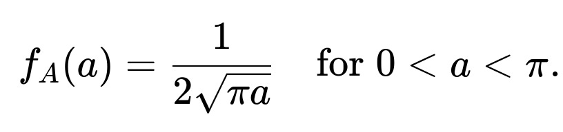 \huge f_A(a) = \begin{cases} \dfrac{1}{2,\sqrt{\pi a}}, & 0 < a < \pi, \ 0, & \text{otherwise}. \end{cases} ]