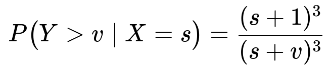 P(Y > v | X=s) = ∫ from y=v to ∞ of f_Y(y|s) dy = ∫ from y=v to ∞ of [ 3(s+1)^3 / (s + y)^4 ] dy.