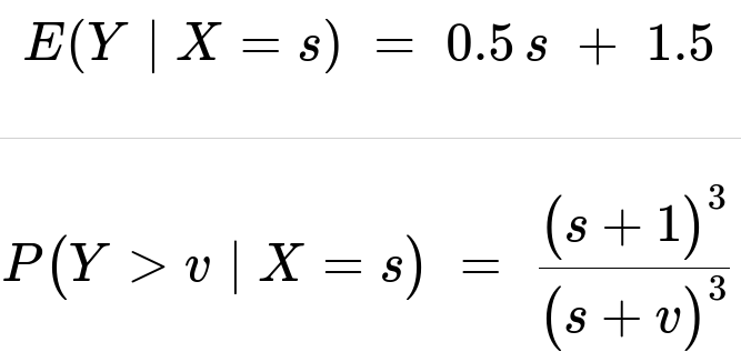 • f_X(x) and f_Y(y|x) would need re-derivation to ensure proper normalization, possibly resulting in expressions like (x + y)^(−(n+something)). • When integrating y * f_Y(y|s), you would end up with a different polynomial or rational function in s. The final closed-form solution might become more complicated and no longer a simple 0.5 s + 1.5. • The tail behavior for large y would differ, changing how quickly P(Y>v|X=s) decays.