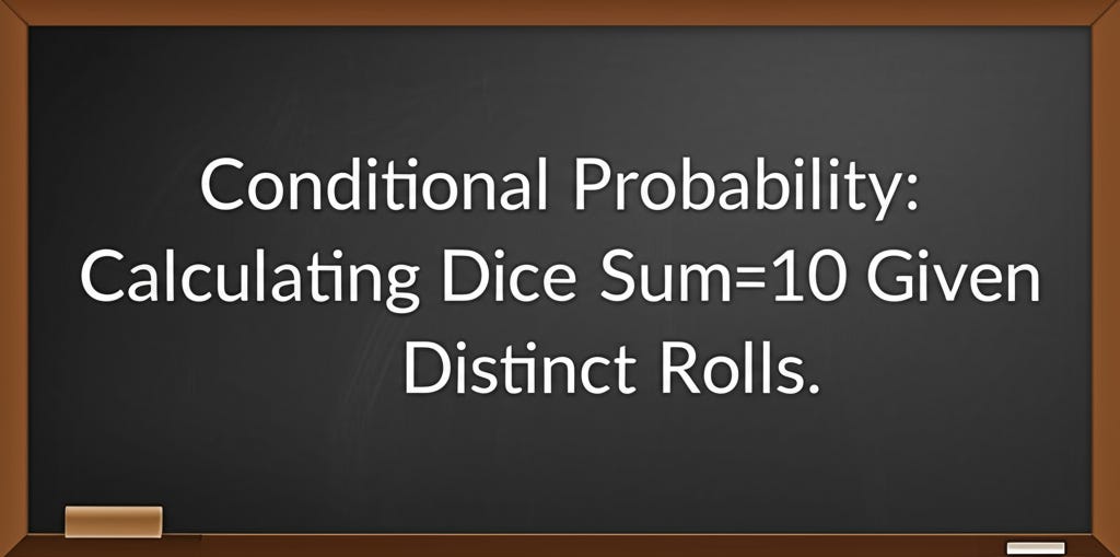 ML Interview Q Series: Conditional Probability: Calculating Dice Sum=10 Given Distinct Rolls.