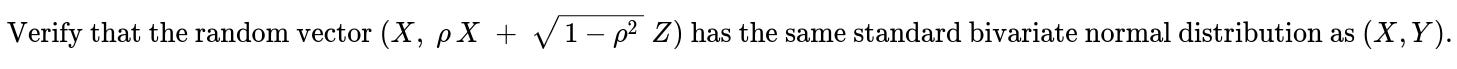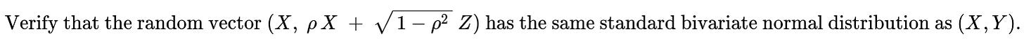 Thus, the vector (V, W) = (X, ρX + √(1−ρ²)Z) has the same mean vector (0,0), identical marginal variances (both 1), and the same correlation ρ as (X, Y). Because it remains a bivariate normal (by construction via linear transformations of a jointly normal pair), it must follow the same distribution as (X, Y).