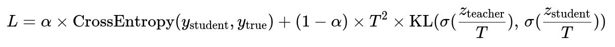 where ( z_\text{teacher} ) and ( z_\text{student} ) are the logits of the teacher and student networks, ( T ) is the temperature scaling factor, and ( \alpha ) is a hyperparameter that balances the hard-label loss with the teacher-based soft-label loss. When ( T > 1), the probabilities in the softmax distribution are “softened,” often making it easier for the student to learn subtle data patterns.