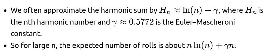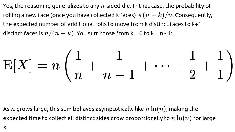 Repeats that are out of order: If you’re waiting for face 2 but keep rolling face 1, it doesn’t advance the sequence. Such scenarios can significantly increase the expected time compared to the standard coupon collector problem.