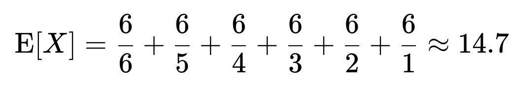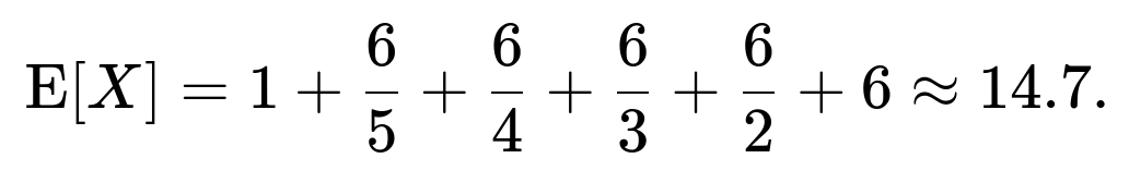 Hence, on average, it takes roughly 14.7 throws of a fair six-sided die to see all six faces at least once.