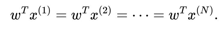 If points ({x^{(1)}, x^{(2)}, \dots, x^{(N)}}) lie in a hyperplane, then any vector normal to that hyperplane is orthogonal to all pairwise differences (x^{(i)} - x^{(j)}). So you want a non-zero (w) that satisfies
